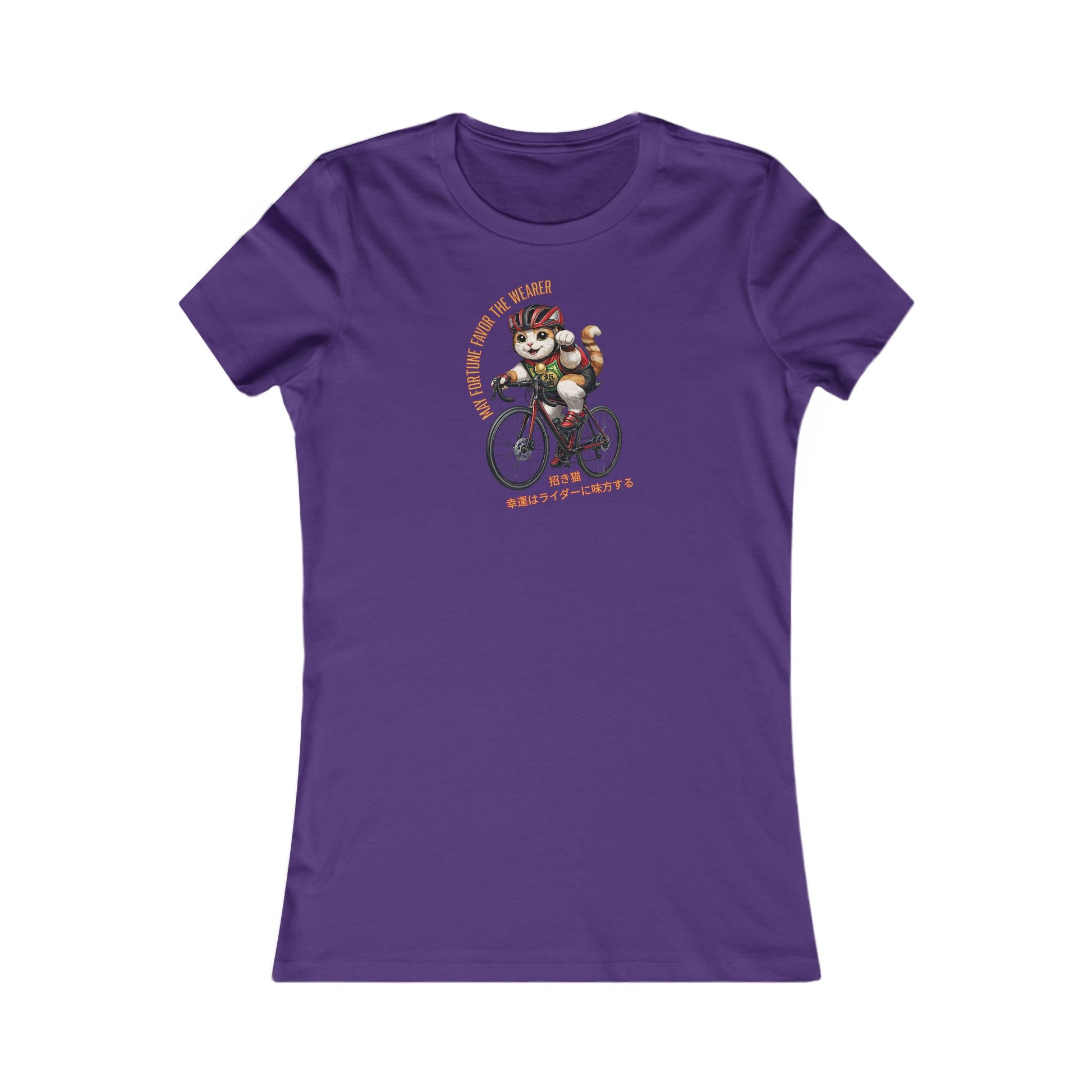 Press your luck with the DEVOTED Lucky Kitty women’s Cycling T-shirt. It's your wearable good luck charm against all woes on future rides! The front defines this piece with it's colorful bicycle-themed Maneki-neko design with the blessing "May Fortune Favor The Rider" in gold print. The front design is complemented by a gold DEVOTED wheel logo on the back. Rides end. Your DEVOTION doesn't.