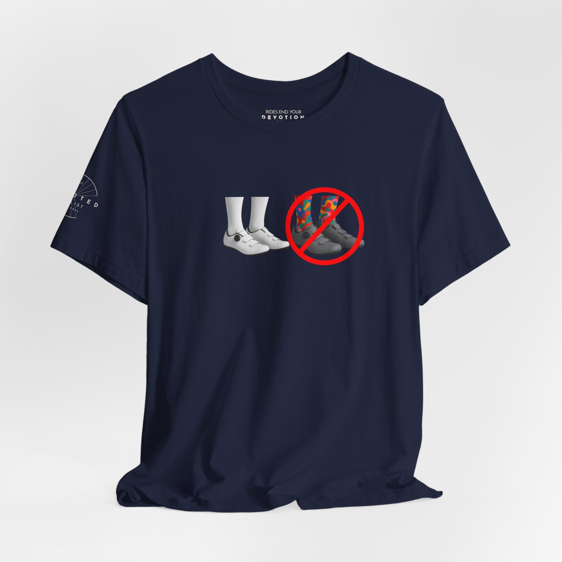 This t-shirt may speak for you with a quiet sense of humor, or not. You're a confirmed member of the white sock and shoe brigade, and want to show off your "colors", ahem, or lack of, proudly. It's a playful nod to those who prefer this classic pro-look over brightly colored cycling socks and non-white footwear. Wear it on relaxed days, or while lounging at home; the fit and breathable fabric keep movement easy and the look casually put-together. Emilio, this one is for you!